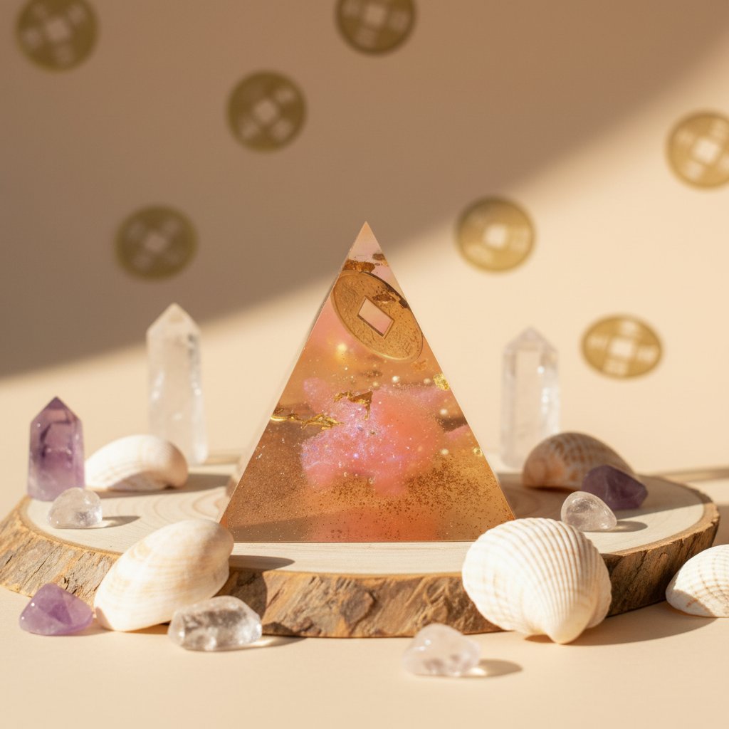 Pyramida s napůl viditelnou želvou a čínskou mincí – symbolem klidné hojnosti, ochrany a trpělivého růstu. Přináší jemnou energii důvěry v život, přirozený tok prosperity a pocit bezpečí ve vlastním rytmu.