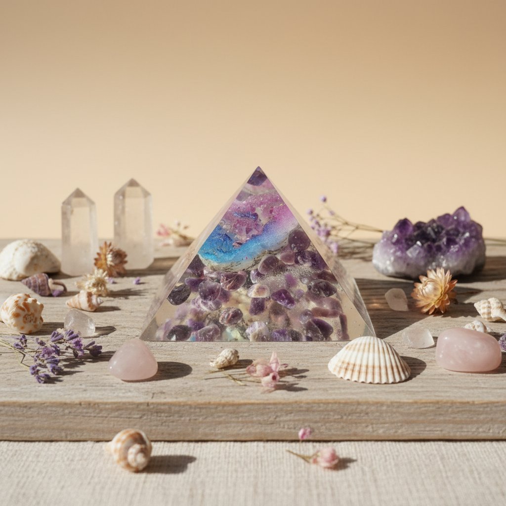 Pyramida s ametystem a aura křemenem – symbolem duchovního světla, vnitřního klidu a otevření vyšším úrovním vědomí.