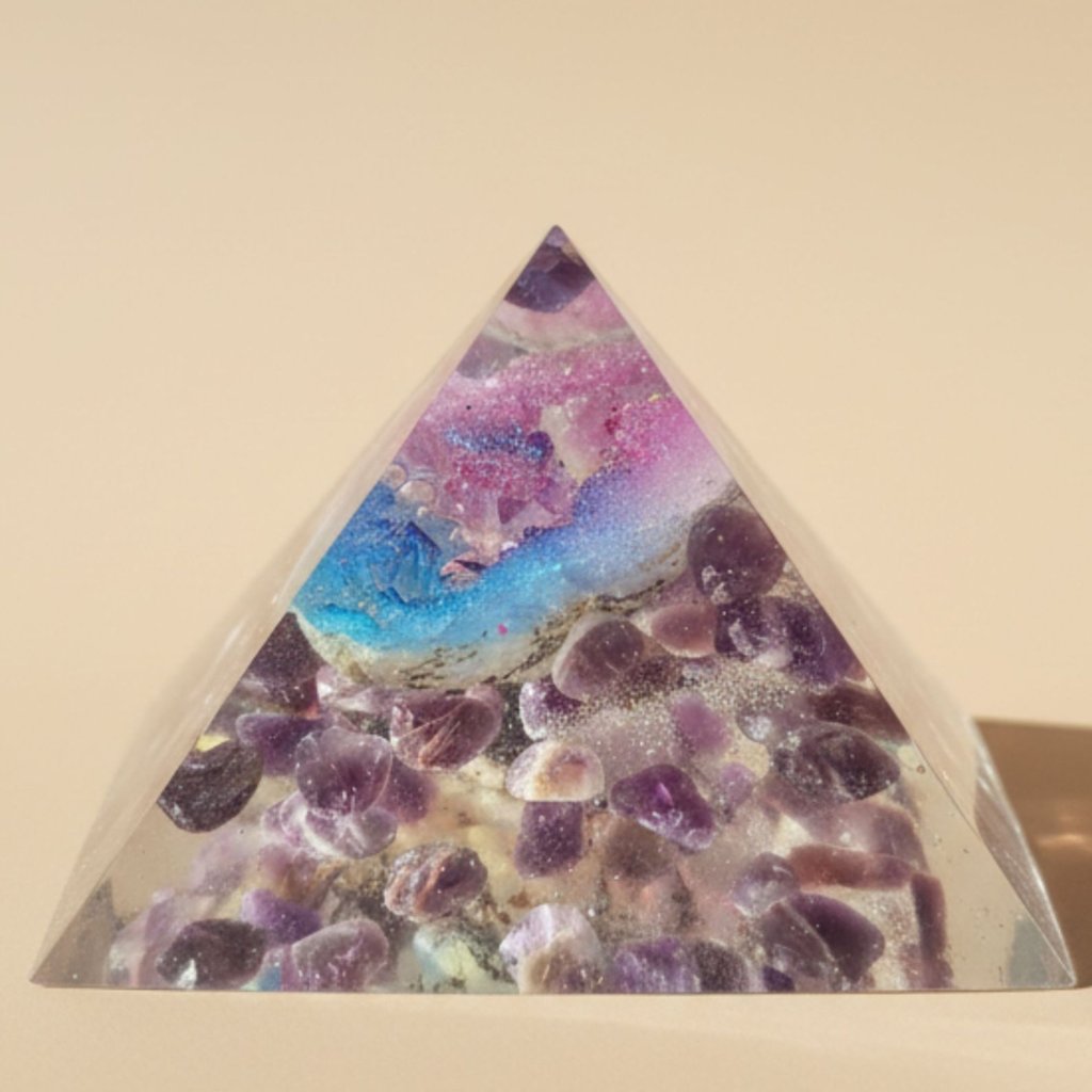 Tato pyramida nese vibraci světla, které prostupuje všemi rovinami bytí. Její zářivé odstíny růžové, fialové a modré vytvářejí prostor pro ticho, klid a hluboké spojení se svou duší.