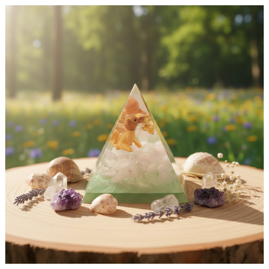 Tato pyramida nese energii klidu a něhy, která se zrcadlí v pohledu malého jelínka – bytosti čisté, vnímavé a citlivé. Její energie tě zve zpomalit, nadechnout se a dovolit si být zranitelná, aniž bys ztratila sílu.
