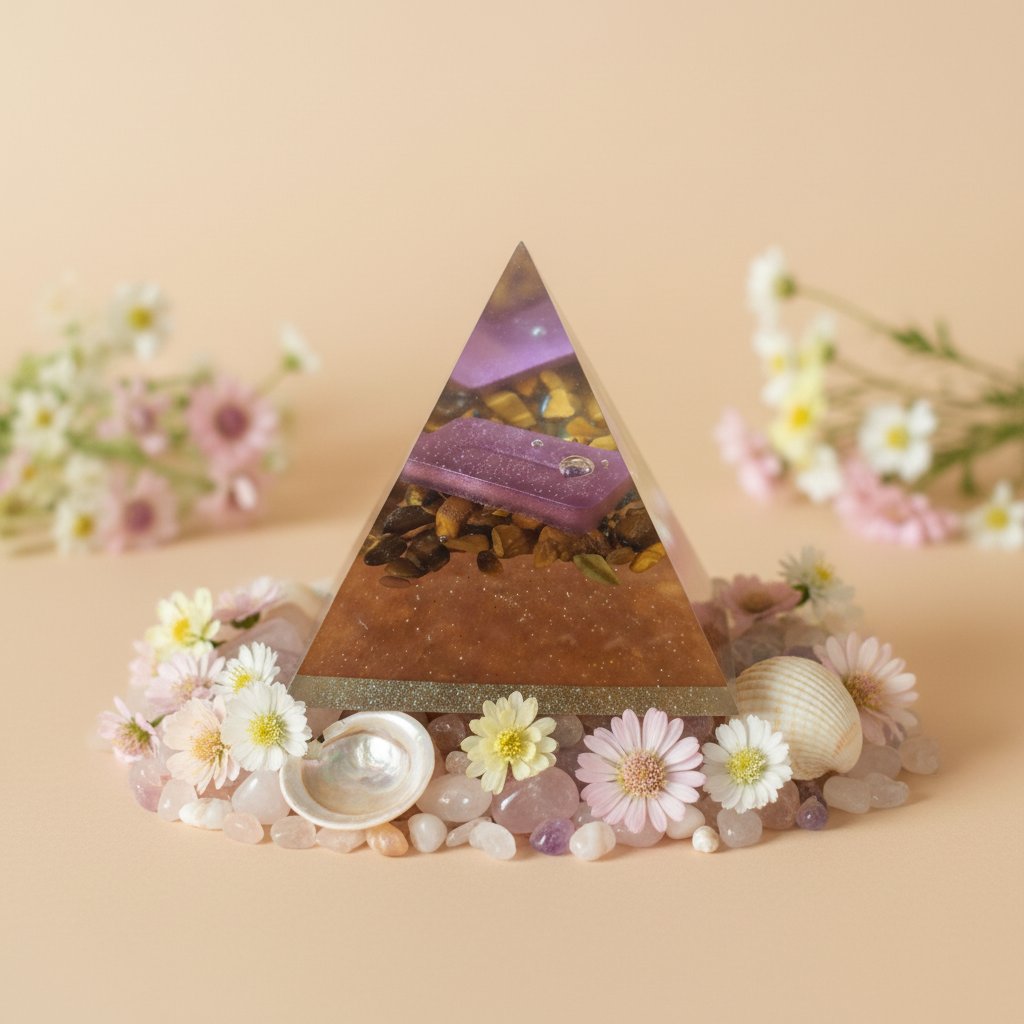 Fialové odlesky v horní části symbolizují duchovní vhled a jasnost – spojují čin s moudrostí, sílu s intuicí. Celá pyramida vyzařuje klidnou, soustředěnou energii, která tě vede k vytrvalosti a odhodlání.