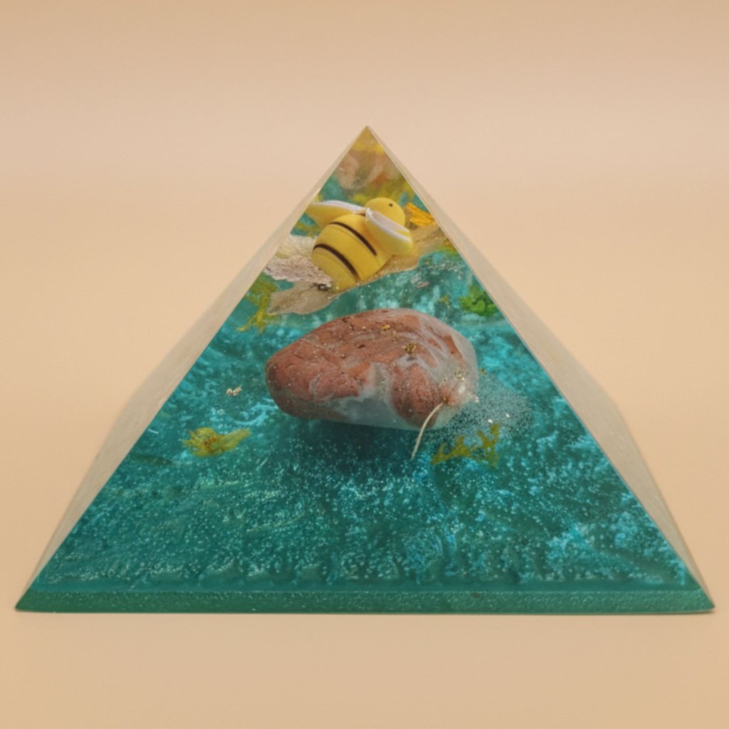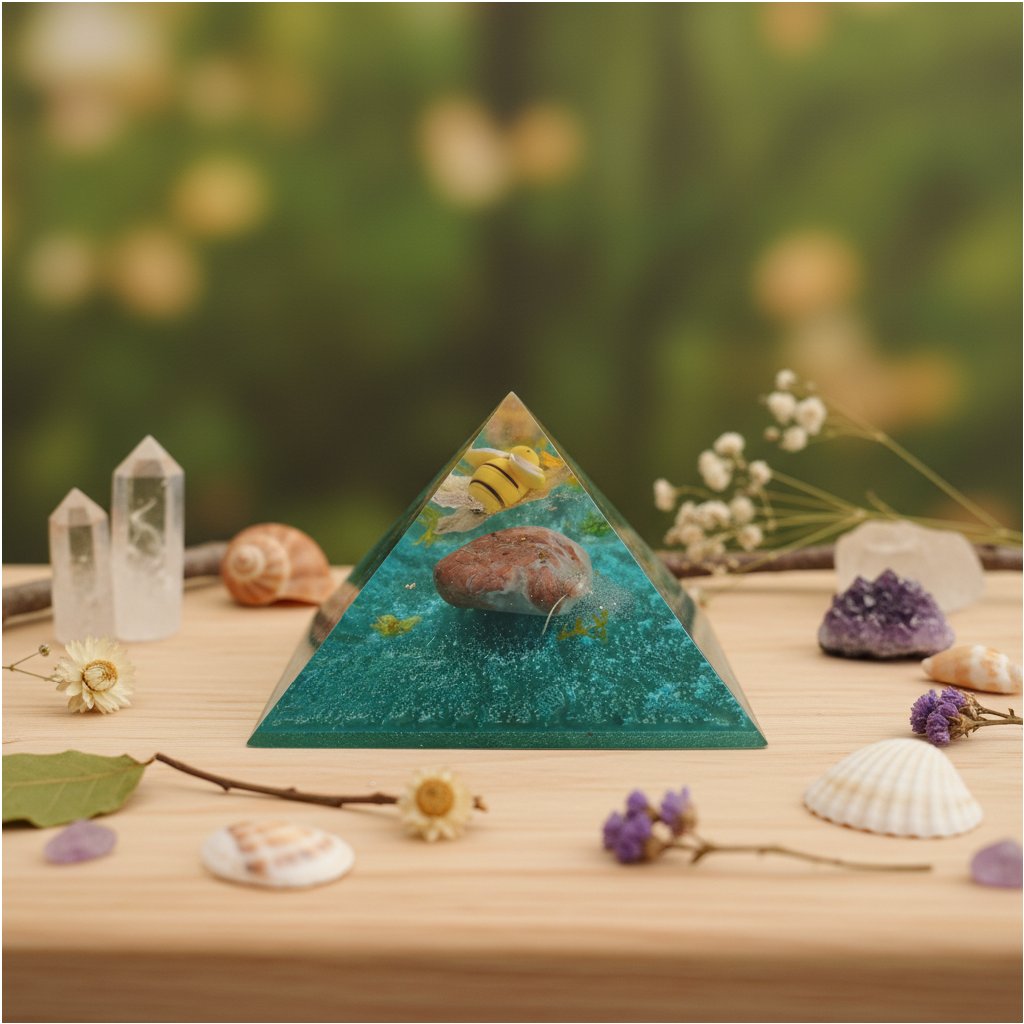 Pyramida s včelkou a jaspisem brekciovým – symbolem vitality, vytrvalosti a síly přírody. Pro ty, co chtějí pracovat tak, aby je to bavilo, aby zůstávali tvůrčí a v radosti a podle přání svého srdce.