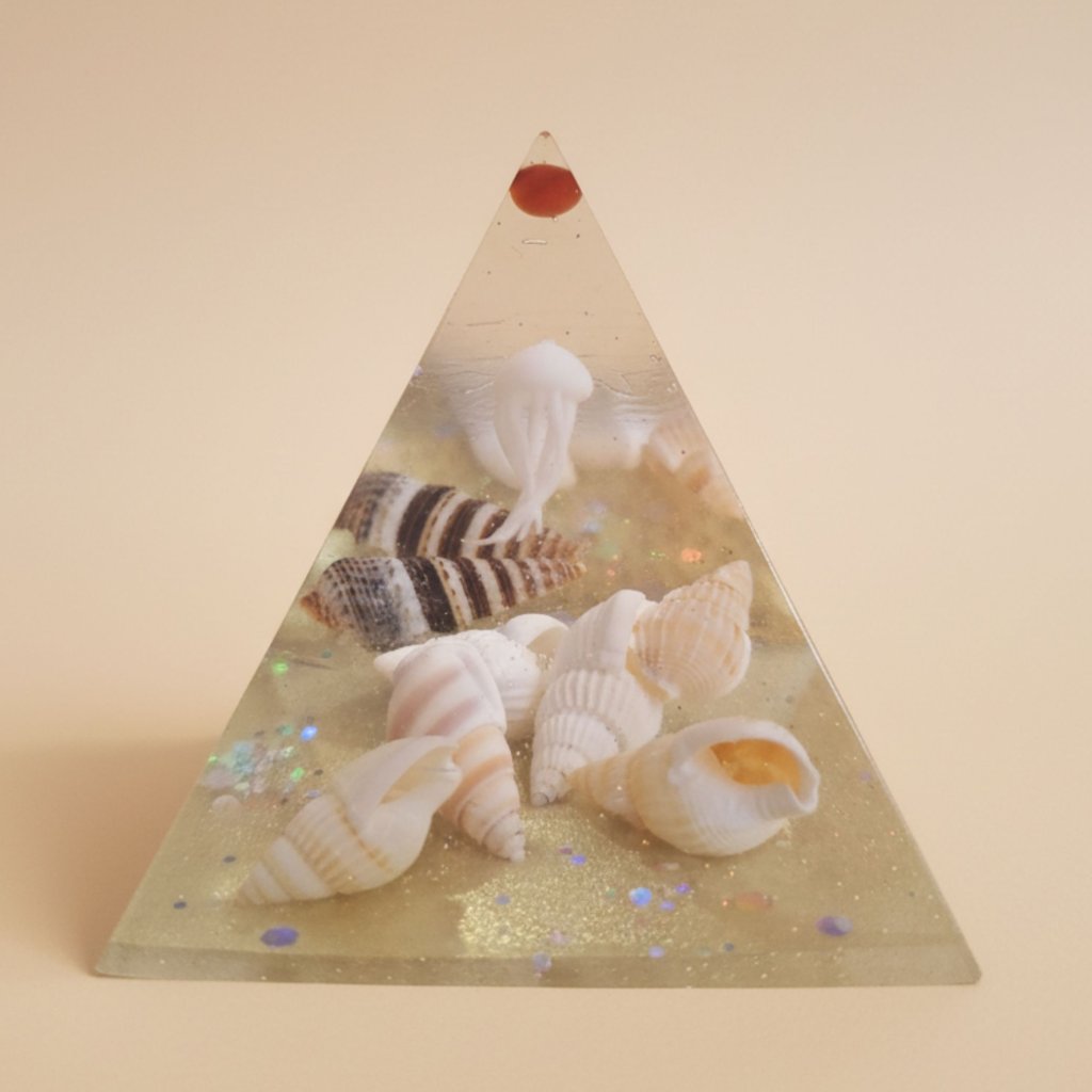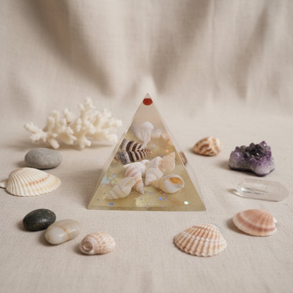 Pyramida s karneolem, medúzou a mušlemi – symbol klidu, plynutí a životní radosti. Pomáhá uvolnit napětí, důvěřovat proudu života a nechat růst svou vnitřní sílu.