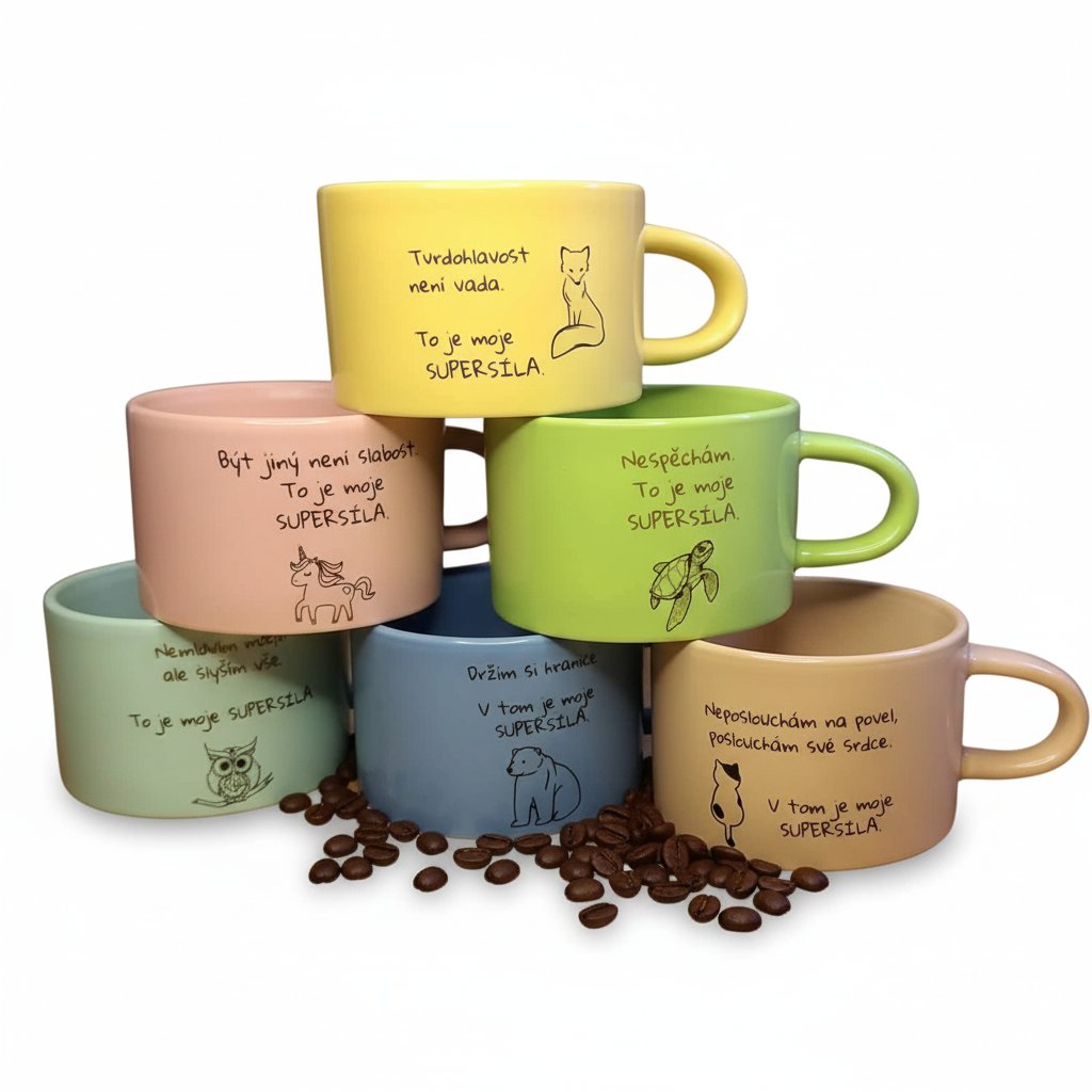 Tahle kompletní sada 6 keramických hrnků z kolekce SUPERSÍLA vznikla jako každodenní podpora na tvé cestě – připomínka, že jsi dost. Že tvé vlastnosti jsou dar. Že tvoje osobnost má sílu měnit svět. ✨